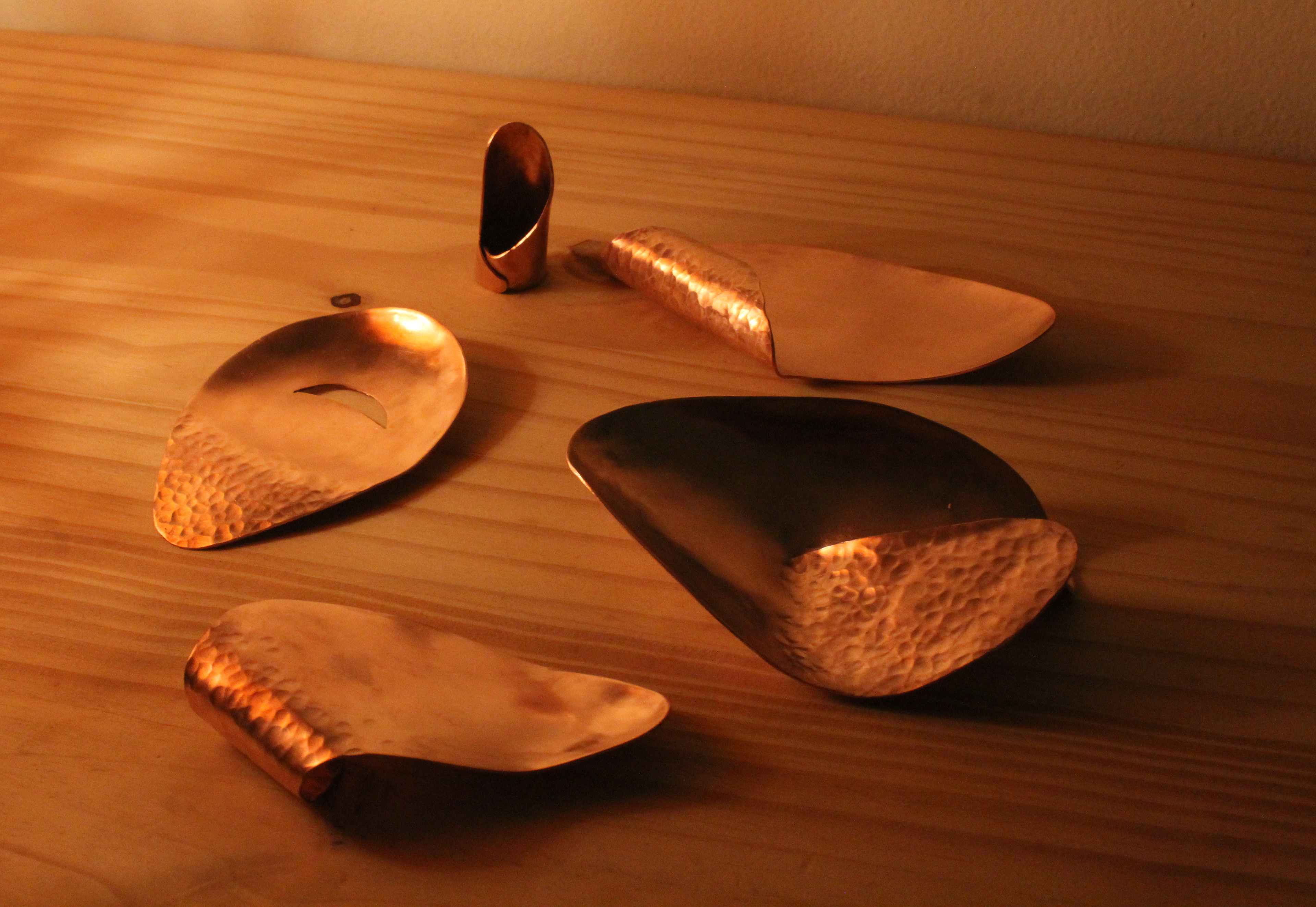 “Copperware” enhances eating experiences through the taste-altering properties of copper while challenging the Western stigma of eating with hands. Copper has a unique influence on taste, altering and enhancing perceived flavors in foods. This collection works at providing a different sensory experience through the use of copper. Alongside, they are designed with finger attachments and curves that fit directly in the palm, redefining the tactile experience of eating.